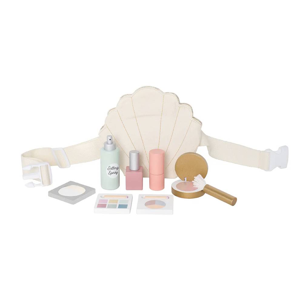 Avec la ceinture de maquillage, tu peux emporter ton maquillage partout facilement. Le sac dans lequel se trouve le maquillage a la forme d'une coquille.