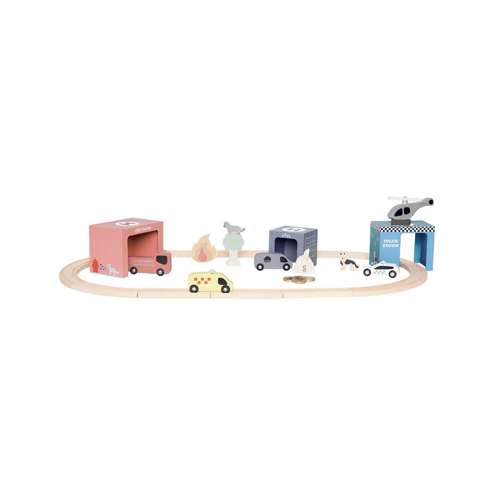 Le circuit de train en bois classique avec véhicules de secours de Jabadabado comprend une station de police, une caserne de pompiers et une prison.